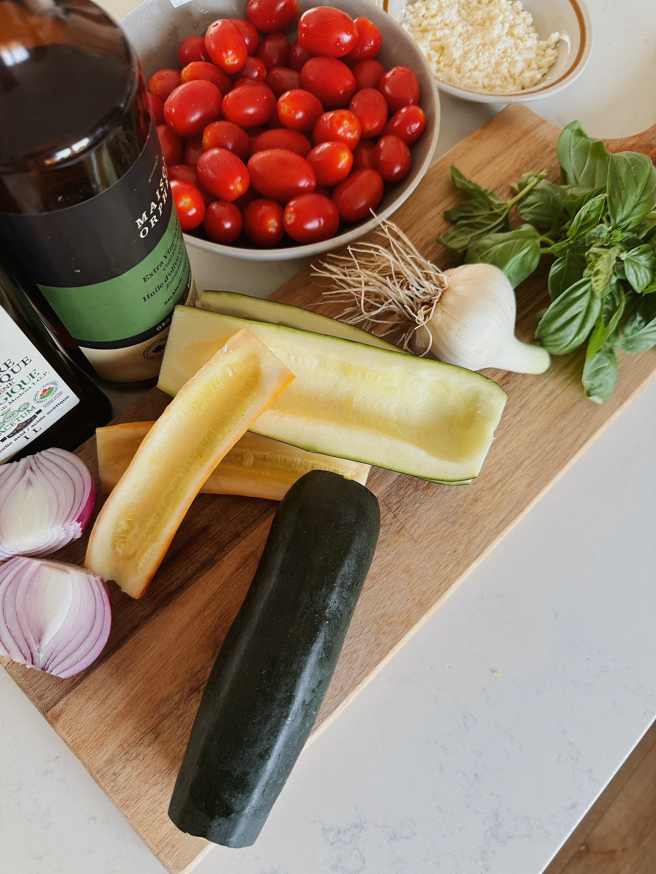 If you're not a fan of zucchini or don't have a grill, the bruschetta topping also goes wonderfully spooned over a piece of crusty sourdough bread. Top with feta and lightly toast for a delicious app or side.